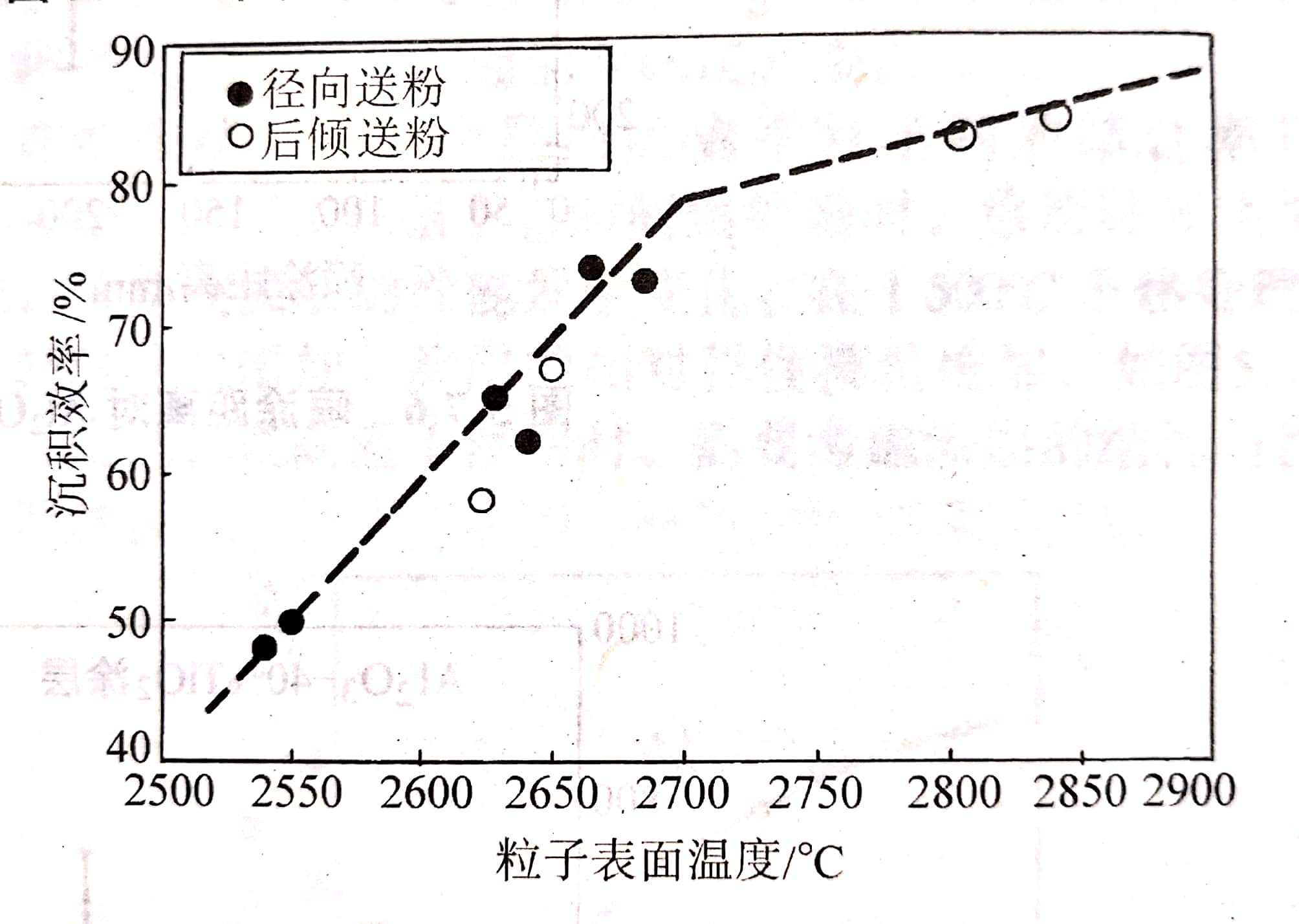 氧化物陶瓷材料噴涂時,粒子的溫度越高,熔化程度越完全,沉積效率越高。圖1與圖2為Metco9M噴槍,采用徑向與后傾送粉調(diào)整粉末送人等離子射流中的位置,分別在不同電弧功率與凈輸人功率測得的沉積效率。從這些結果難以看出功率與沉積效率的直接關系。圖3為采用DP-2000測速裝置測試的不同等離子噴涂條件下的YSZ粒子的表面溫度后,獲得的表面溫度與沉積效率之間的關系。可以看出隨粒子表面溫度的升高,沉積效率直線增加,當粒子表面平均溫度超過其熔點后,沉積效率增加不再顯著。這些結果表明提高沉積效率的關鍵在于使粒子達到完全熔化狀態(tài)。